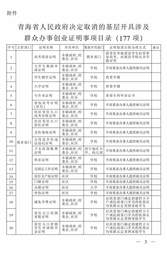附件:青海省人民政府决定取消的基层开具涉及群众办事创业证明事项目录(177项)